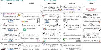 Participants enjoy a shared monthly calendar of activities such as exercise, mindfulness, crafts, and social programs. A home‑cooked lunch is served daily at 11:30 AM, and an on‑site food bank is available to support individual needs.