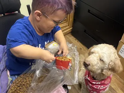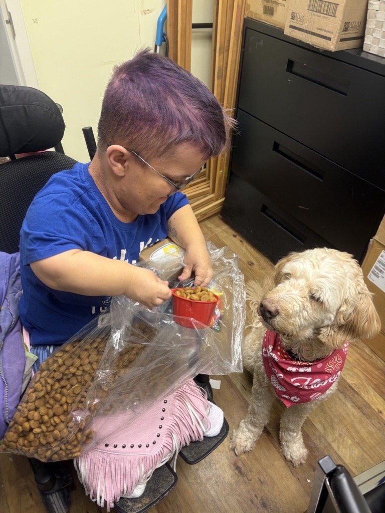 Today Charlie helped one of our clients break up a huge bag of donated dog food at our day program.